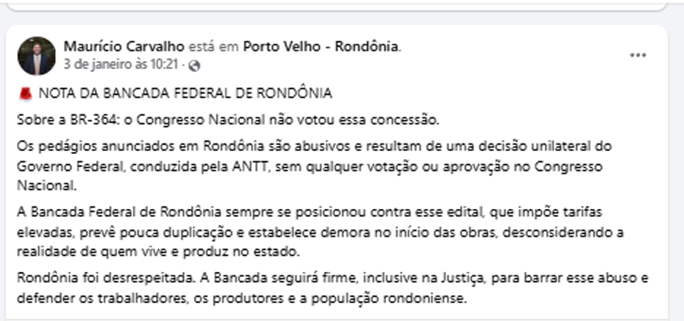 É nesse cenário que o líder da bancada federal de Rondônia, o deputado Maurício Carvalho (União Brasil), publica uma nota dura contra o modelo de concessão. O texto afirma que o Congresso Nacional não votou a concessão, classifica as tarifas como abusivas, atribui a decisão ao governo federal por meio da ANTT e promete reação política e judicial. O conteúdo deixa implícita a ideia de jogar no colo do governo federal algo que é inerente ao desenho institucional do Executivo. Como se bancadas federais País afora participassem legislativamente de concessões feitas em rodovias que afetam o cotidiano de suas regiões originais.